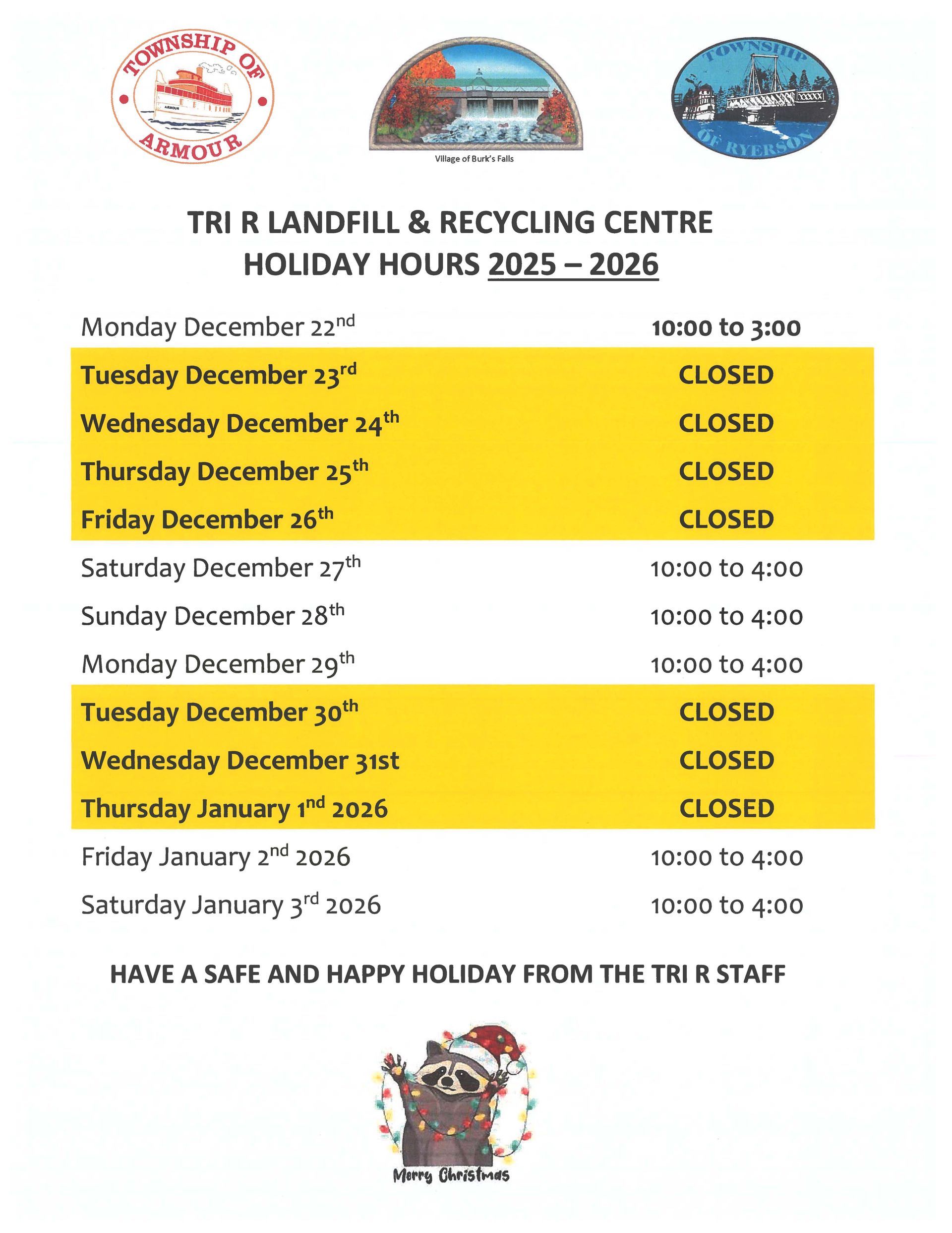 Please note the closure dates and reduced hours at the landfill over the holiday season.